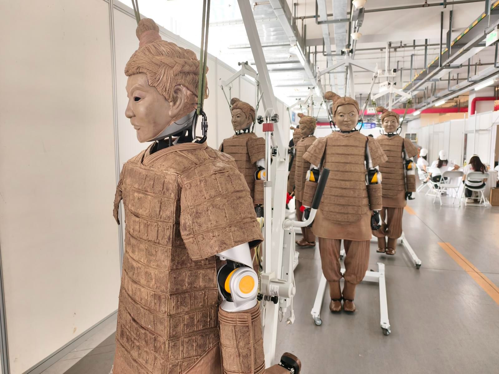 记者在储藏间看到,机器人的秦俑战甲后背部分采用了小孔透气的面料。徐钦解释,那里是机器人的散热区,在设计表演服装之初,团队就考虑到了机器人散热的问题,机器人后背、关节连接处等地方都做了特殊处理。