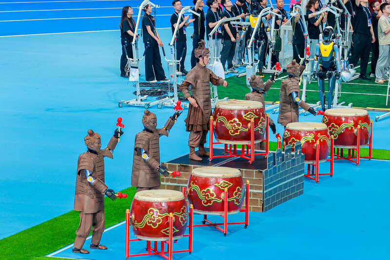 鼓声响起,9台人形机器人“光子”身披3D打印的秦俑战甲,与北京舞蹈学院舞蹈演员共同摆动双臂,跟着节奏起舞。在世界人形机器人运动会赛场一侧,这支机器人群舞节目刚开演,看台上多位观众就打开手机拍照,还有离比赛区域较远的观众索性掏出望远镜观看。