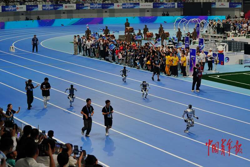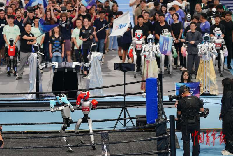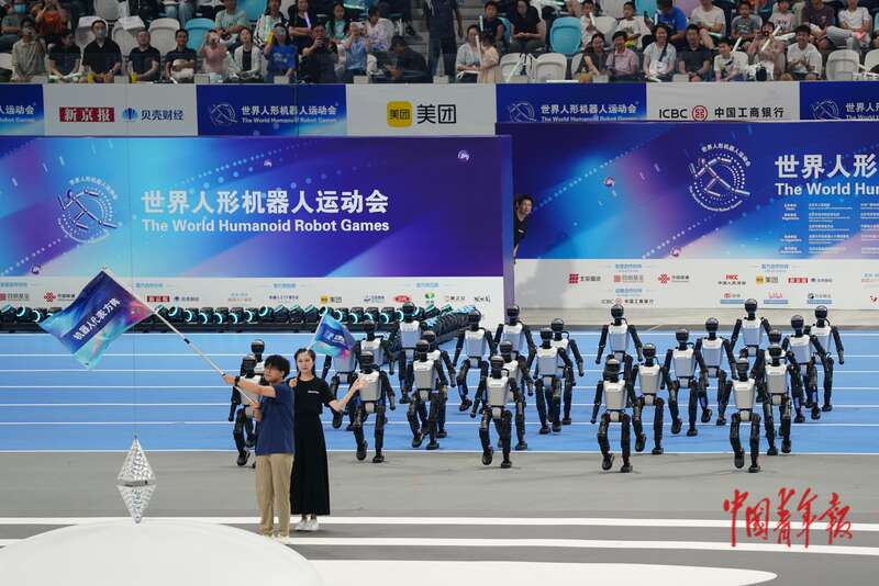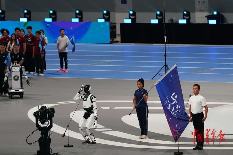 8月14日,北京国家速滑馆“冰丝带”,2025世界人形机器人运动会开幕式现场。中青报·中青网记者 赵迪/摄