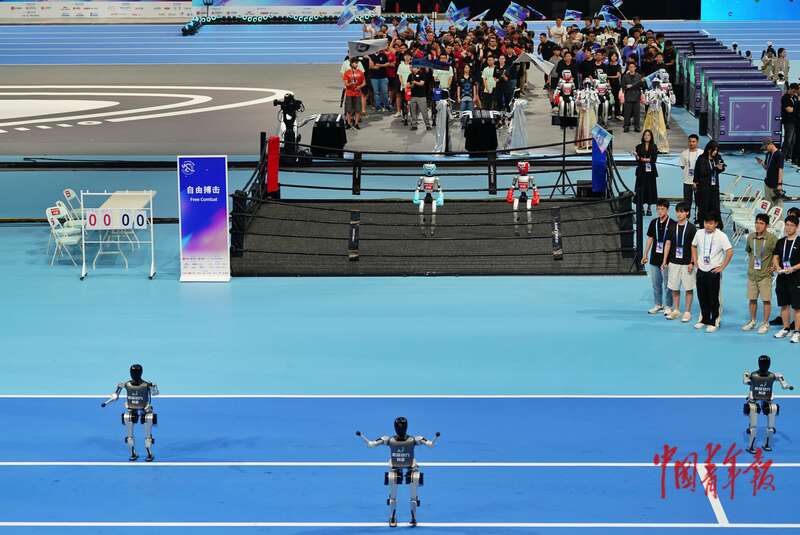8月14日,北京国家速滑馆“冰丝带”,机器人自由搏击展示。中青报·中青网记者 赵迪/摄