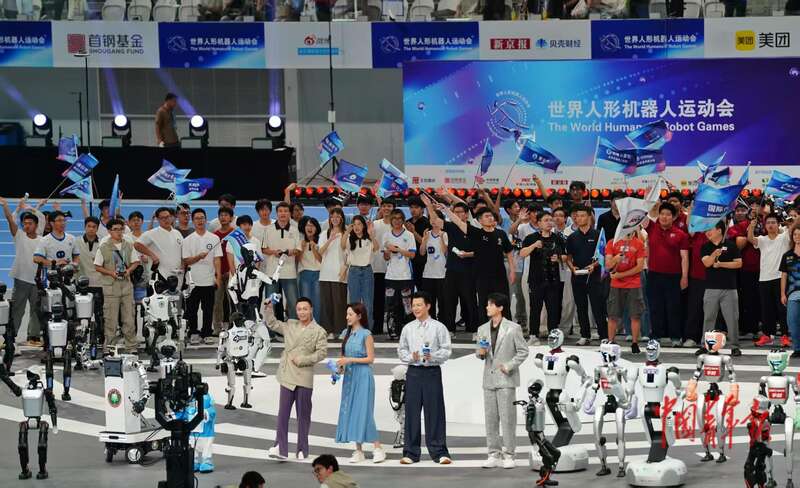 8月14日,北京国家速滑馆“冰丝带”,2025世界人形机器人运动会开幕式现场,人们和机器人一起向在场的观众挥手致意。中青报·中青网记者 赵迪/摄