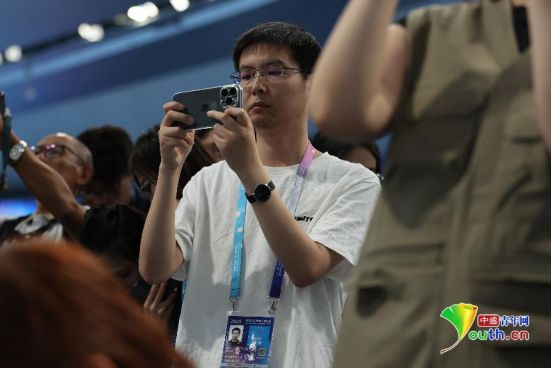 8月15日,2025世界人形机器人运动会在国家速滑馆“冰丝带”展开首个比赛日的争夺,宇树科技H1机器人当日夺得两个田径项目冠军。图为宇树科技CEO王兴兴现身颁奖现场,举起手机在台下默默记录。中国青年网记者 杨逸凡/文并摄