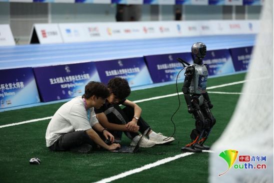 8月15日,2025世界人形机器人运动会进入首个比赛日。图为在午间休赛时间,两名大学生队员正在球场上席地而坐争分夺秒调试参赛“球员”。中国青年网记者 杨逸凡/文并摄
