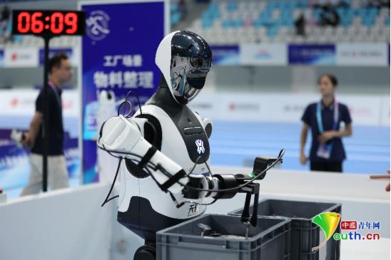 8月15日,2025世界人形机器人运动会进入首个比赛日。本届赛事最大的亮点之一是开设了场景赛,旨在展示不同机器人在不同应用场景中的表现。图为北京人形机器人创新中心有限公司的天轶机器人正在工厂场景类的物料整理比赛中。中国青年网记者 杨逸凡/文并摄