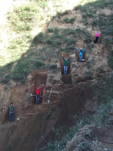 找蜗牛时,有人碰到过颜色翠绿的毒蛇,也误入过杂草环绕的坟包。有人说地层里很多硬土块,有时需要用手捏碎,有次回去后手在发抖。董亚杰说,黄土剖面上草深,有时不知道下面是实是虚,有一次他踩空,从两三米高处掉下来。他有位师姐,走在高处时腿脚发软,从坡上滚下来,落到沟底,昏迷了,幸而没有大伤。