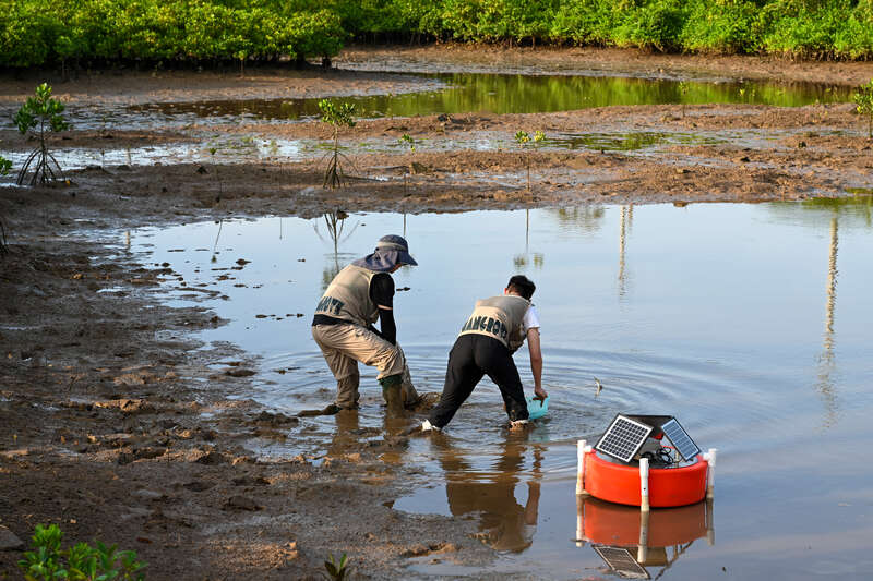 在海南儋州新英湾的退塘还林区内,队员黄翯宸在齐膝的泥地里,丈量着红树林的“身高体重”,记录下树高、胸径、冠幅等生态数据,昔日海鸭养殖塘,现已成为红树幼苗的聚集区。截至目前,这里的红树林修复项目退塘面积已达到460公顷,并划分出五类修复区,每片区保留约60%的潮沟面积以保证潮汐通道的生物多样性。