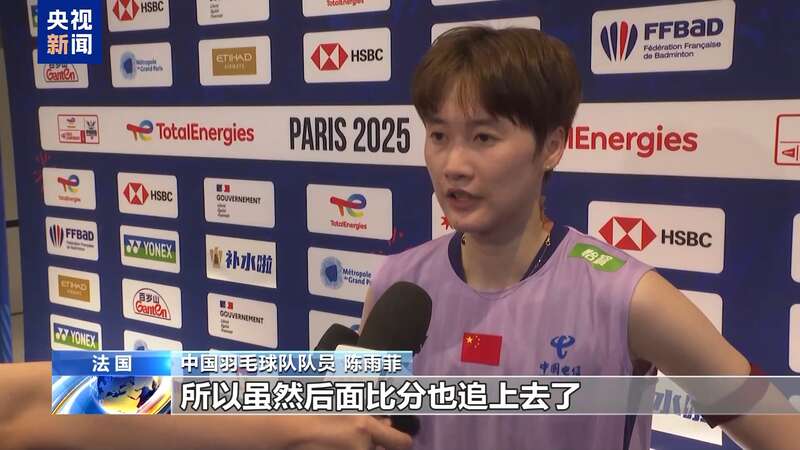中国羽毛球队队员 陈雨菲:第二局在领先的情况下出现了连续丢分,那一下自己的整个精力包括速度都出现了一些问题,所以虽然后面比分也追上去了,但还是在出手的时候也有一些犹豫吧。