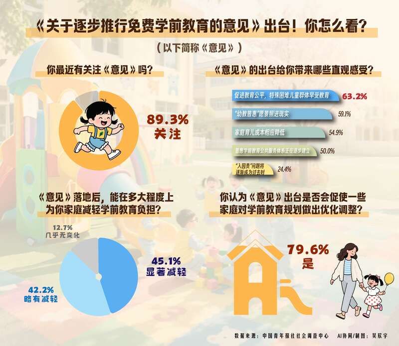 8月5日,国务院办公厅印发《关于逐步推行免费学前教育的意见》(以下简称《意见》),明确从2025年秋季学期开始,免除公办幼儿园学前一年在园儿童保育教育费。近日,中国青年报社社会调查中心联合问卷网(wenjuan.com),对1334名受访者进行的一项调查显示,89.3%的受访者关注了《意见》,63.2%的受访者认为这一政策促进教育公平,79.6%的受访者认为政策的出台会促使一些家庭对学前教育规划做出优化调整。