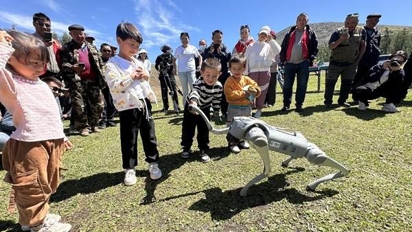 新疆科技馆科普大篷车开到了中蒙边境的新疆阿勒泰地区青河县萨尔托海乡喀拉乔拉村套查干湖夏牧场,小朋友与机器狗开心互动。新疆科技馆供图