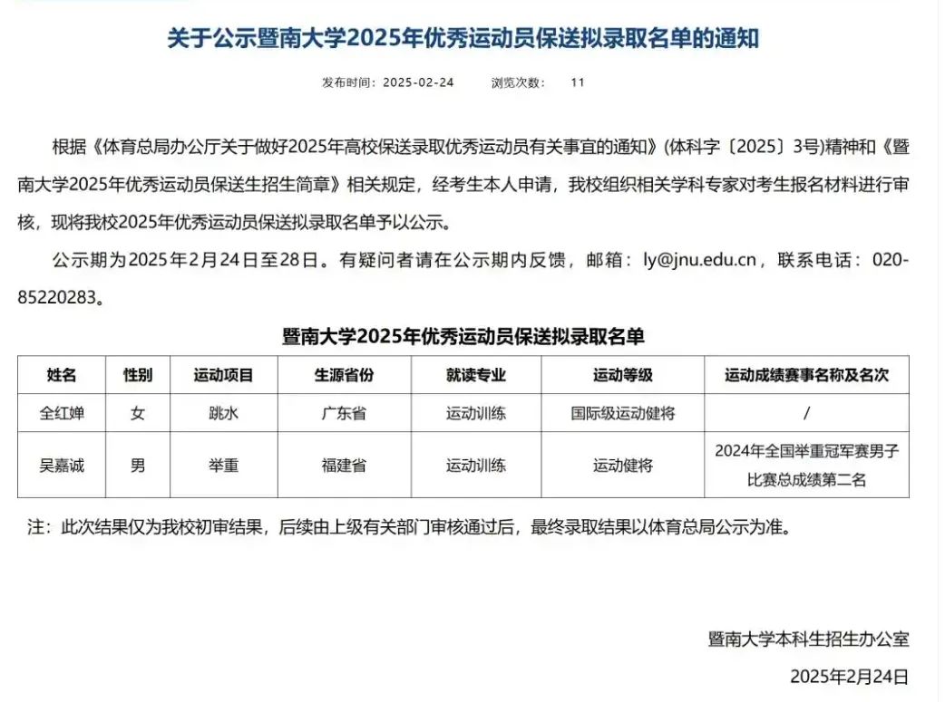 据悉,全红婵并非首位进入暨南大学的跳水奥运冠军,她的师兄谢思埸、陈艾森均为暨南大学校友。