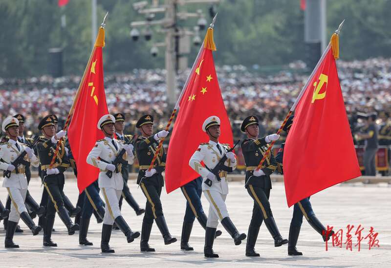 9月3日,北京,中国人民解放军仪仗方队阔步走来,旗手高擎党旗、国旗、军旗。中青报·中青网记者 曲俊燕/摄