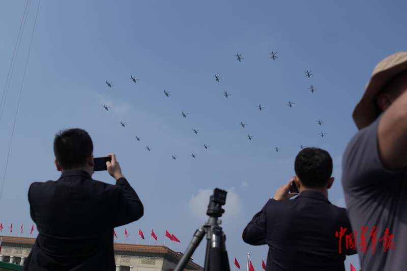 9月3日,北京天安门广场,人们在拍摄由26架直升机组成巨大的“80”字样。中青报·中青网记者 李隽辉/摄