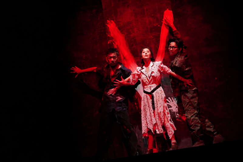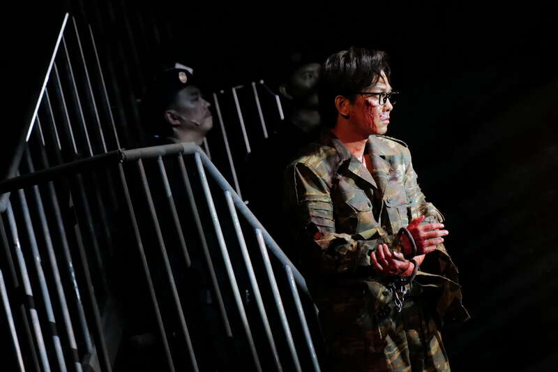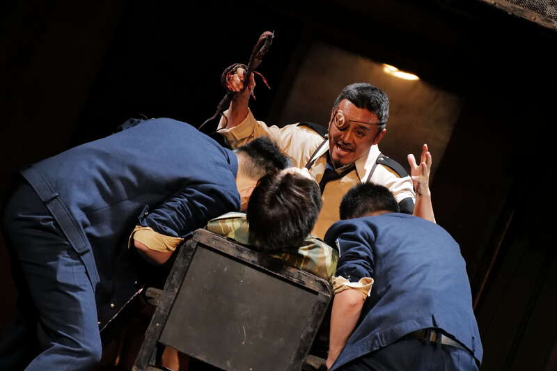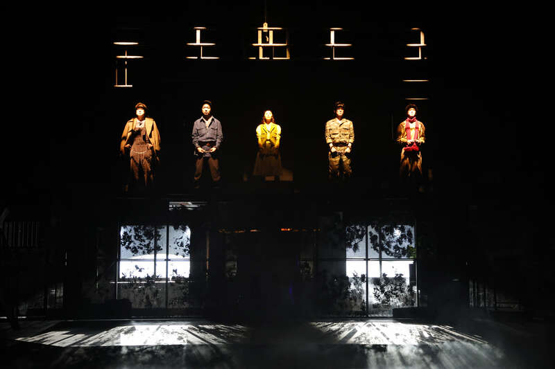 在本次重排的尾声,查明哲赋予结局一个极具冲击力的新落点:当3名游击队员在墙面上奋力刻下象征胜利的“V”字、随即在机枪扫射中倒下之后——舞台的边界被彻底打破。民团团丁猛然冲下观众席,冰冷的舞台射灯如同审讯者的目光一般扫过全场观众。此时,一声凌厉的指令撕裂剧场:“把他们带到阁楼上去!”