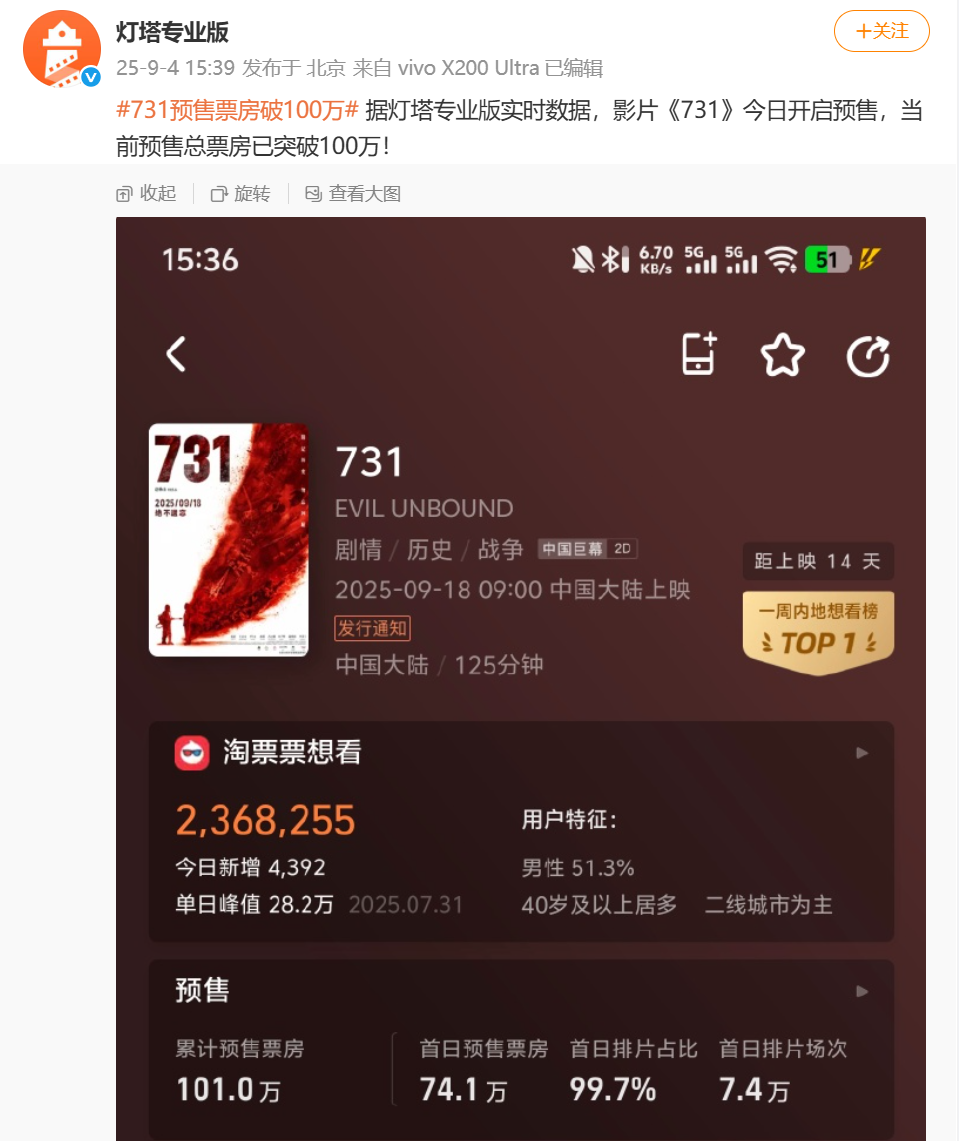 猫眼专业版数据显示,电影《731》目前的“猫眼想看数”已经突破430万,暂列近期“猫眼想看榜”第一。