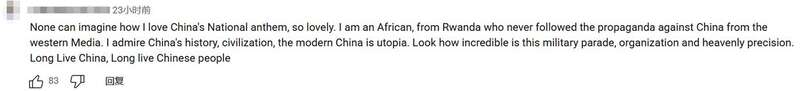 一名卢旺达网友评论:“没人能想象我有多爱中国国歌,它太动听了。我是一名非洲人,来自卢旺达,从未被西方媒体那些抹黑中国的宣传所影响。我钦佩中国的历史与文明,如今的中国就像一个理想国度。看看这场阅兵——组织安排周密有序,动作精准得令人惊叹。中国万岁,中国人民万岁!”