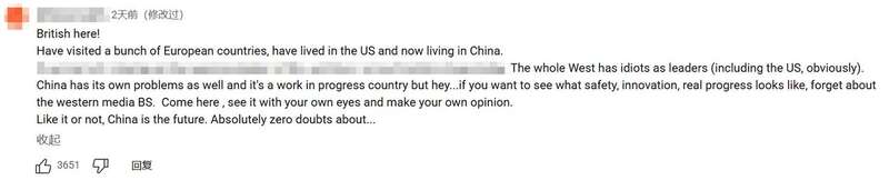 英国网友评论:“我去过不少欧洲国家,在美国生活过,现在定居中国。整个西方世界的领导人都不怎么样(显然,美国也包括在内)……如果你想看看什么是安全、什么是创新、什么是真正的发展进步,别再信西方媒体那些胡扯了。亲自来中国看看吧,用自己的眼睛去观察,然后形成自己的判断。不管你愿不愿意承认,中国就是未来。对此,我没有丝毫怀疑。”