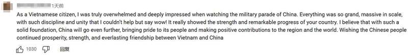 越南网友也写道:“作为一名越南公民,我在观看中国的阅兵仪式时,内心受到了极大触动,也留下了深刻印象。阅兵场面宏伟壮观、规模宏大,队伍纪律严明、团结一心,我不禁为之惊叹!这充分展现了贵国的实力与非凡的发展成就。我相信,凭借如此坚实的基础,中国必将迈向更高的发展阶段,为中国人民带来骄傲,也为地区和世界作出积极贡献。祝愿中国人民生活持续繁荣、国家日益强盛,也祝愿越中两国友谊长存!”