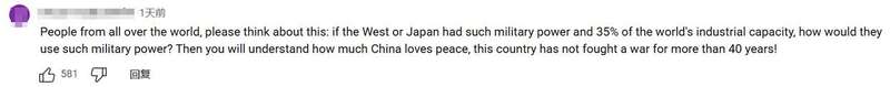另一条留言也表示:“全世界的人们,请想一想:如果是西方各国或日本拥有这样的军事实力,以及占全球35%的工业产能,他们会如何使用这样的军事力量?想清楚这一点,你们就会明白中国有多热爱和平,这个国家已经40多年没有打过仗了!”