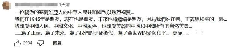 一名塞尔维亚网友表示:“一位骄傲的塞尔维亚人向中华人民共和国致以热烈祝贺,我们在1945年是盟友,现在也是盟友,未来也将继续是盟友,因为我们站在善、正义与和平的一边。我热爱中国人民、中国文化、中国风俗,也热爱美丽的中国和中国所有的自然美景。为了正义,为了未来,为了我们的子孙后代,为了全世界的爱与和平,万岁!!!”