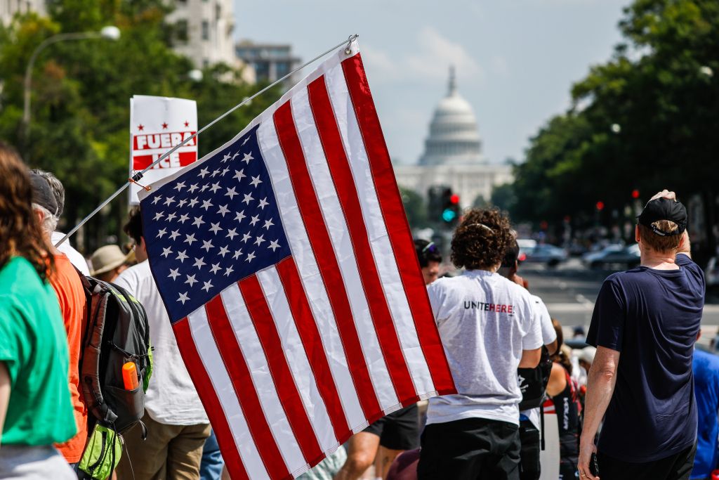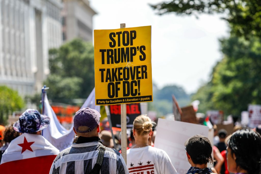 当地时间2025年9月6日,美国华盛顿,抗议者在华盛顿特区举行示威活动,反对联邦政府加强对该地警察部门的控制。此次名为“我们都是特区:全国游行”的示威活动,参与者从子午线山公园游行至自由广场。