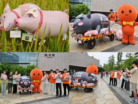 四川农业大学巡游花车以“庆丰收、迎新生、展新农”为主题,由校团委牵头统筹,联合动物科技学院、农学院共同策划打造。花车整体设计紧扣学校农业学科优势,既生动传递了丰收的喜庆氛围,又体现了川农服务产业发展的“硬核”实力。为让农业科技更具感染力,巡游花车巧妙融入现代农业科技元素,通过立体造型、动态展示等方式,将农业的蓬勃生机定格眼前。其中,外形极具辨识度的“掌上明猪号”花车尤为吸睛——该车以学校培育的天府黑猪为设计灵感,天府黑猪是由四川省重大科技专项支持培育的新品种,由邛崃市嘉林生态农场和四川农业大学共同培育而成。作为川内首个以本土地方猪遗传资源为主要育种素材培育的“国审猪”品种,融合了四川本地成华猪种和英国引进品种巴克夏猪的基因,是地道的“中英混血”。天府黑猪呈现出被毛全黑、皮厚、肉质优良、综合生产性能高(繁殖性能好、生长快、耗料少、产肉性能高)和遗传性能稳定的品种特征。本次打造的巡游车身搭配憨态可掬的天府黑猪卡通形象,瞬间点燃了迎新现场的热烈氛围。沿途师生纷纷驻足观赏,新生与家长更是主动上前拍照合影,用镜头记录下这一兼具农韵与青春气息的独特瞬间。