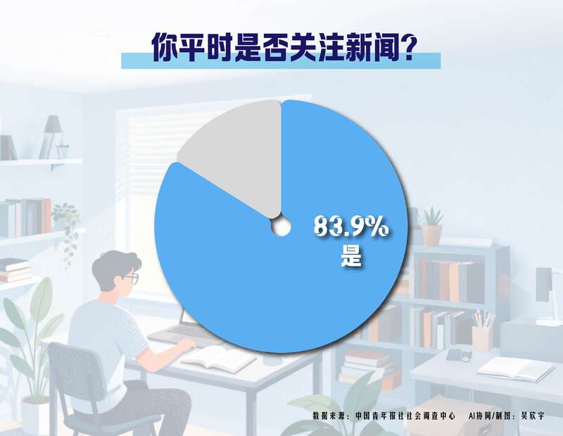 调查显示,83.9%的受访青年平时关注新闻,其中28.5%的受访青年非常关注。