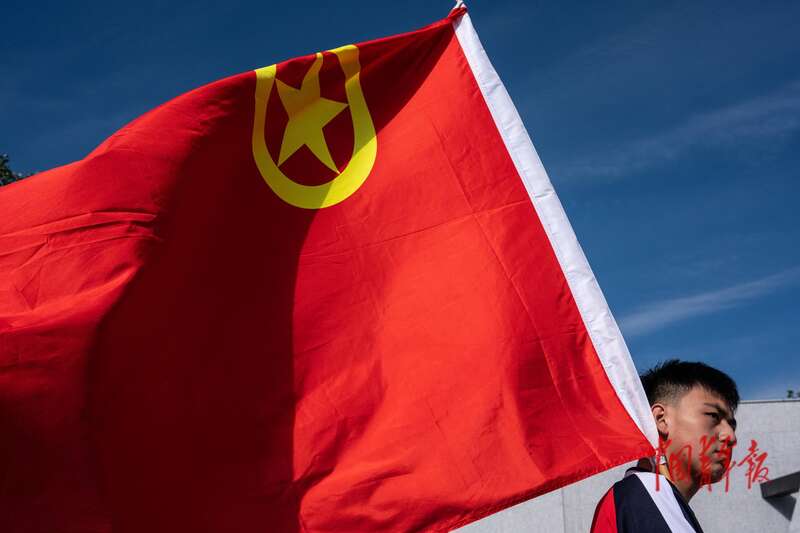 9月17日,辽宁省沈阳市“九·一八”历史博物馆,一名扛着团旗的学生。中青报·中青网记者 李隽辉/摄