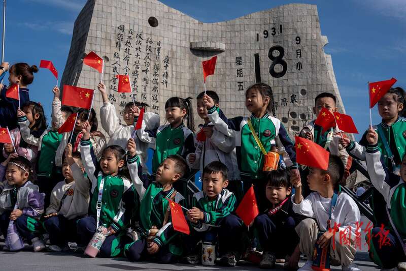 9月17日,辽宁省沈阳市“九·一八”历史博物馆,前来参观展览的小朋友们在残历碑前挥舞国旗,准备合影留念。随着“九一八事变”纪念日临近,辽宁省沈阳市“九·一八”历史博物馆迎来参观客流高峰。据了解,每年9月18日前后,博物馆访问量都会激增。人们走进博物馆,进一步了解战争历史,缅怀和告慰先烈,感知伟大抗战精神。今年是中国人民抗日战争暨世界反法西斯战争胜利80周年。作为纪念活动之一,9月18日,辽宁省委、省政府将在沈阳“九·一八”历史博物馆举行勿忘“九一八”撞钟鸣警仪式。中青报·中青网记者 李隽辉/摄