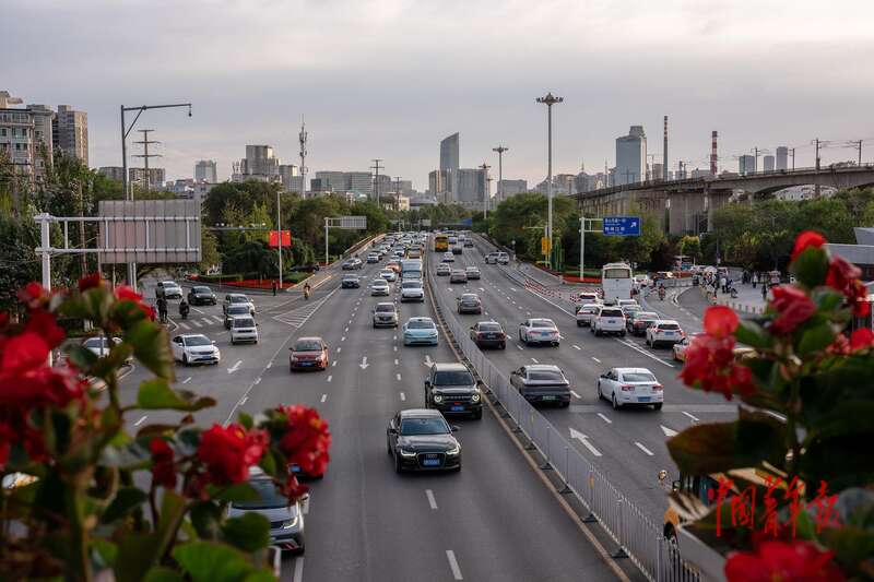 9月16日下午,辽宁省沈阳市,与“九·一八”历史博物馆一墙之隔的马路上车流如织,夕阳余晖照在远处的高楼上。中青报·中青网记者 李隽辉/摄