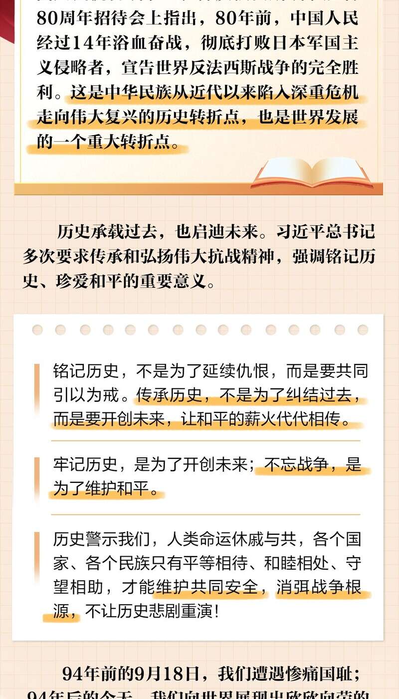 习近平总书记曾多次阐释九一八事变的重要启示意义,指出“空前的民族灾难唤起了空前的民族觉醒”,“谱写了爱国主义的英雄壮歌”。