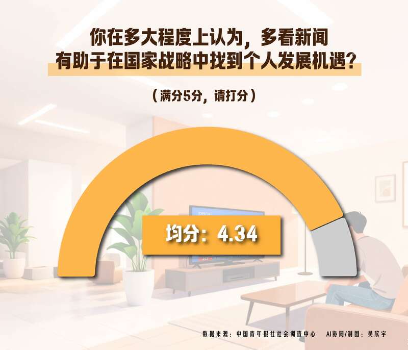 你在多大程度上认为,多看新闻有助于在国家战略中找到个人发展机遇?数据显示,在满分5分的情况下,受访青年平均打出4.34分,近半数(49.1%)受访青年打出满分。
