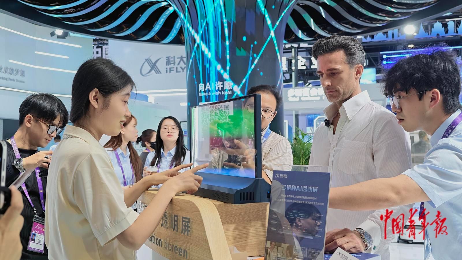 9月18日,在广西南宁举办的东博会上,科大讯飞展出的多语种AI透明屏让中外观展者无障碍交流。中青报·中青网记者 谢洋/摄