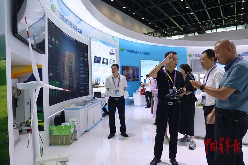 9月18日,在广西南宁举办的东博会上,广西环保产业投资集团有限公司代表(右四)向客户介绍该公司研发的全自动塔筒检测机器人。该机器人融合深度学习模型,能够在无需人工干预的情况下,自主完成对风电塔筒的焊缝、垂直度等检测任务。中青报·中青网记者 谢洋/摄