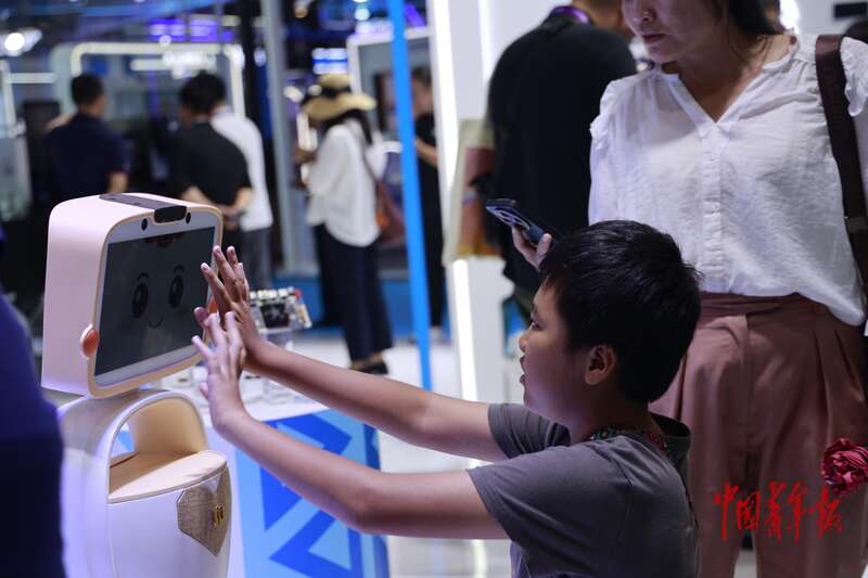 9月18日,在广西南宁举办的东博会上,一名青少年与机器人互动。中青报·中青网记者 谢洋/摄