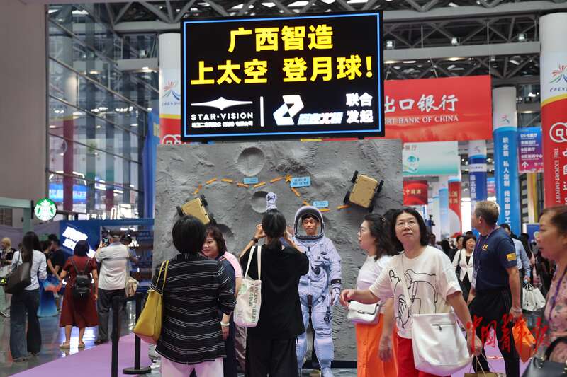 9月18日,在广西南宁举办的东博会上,“广西智造上太空登月球”展台吸引众多观众打卡拍照。中青报·中青网记者 谢洋/摄