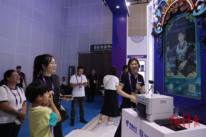 9月18日,在广西南宁举办的东博会上,一对母子体验AI生图技术。中青报·中青网记者 谢洋/摄