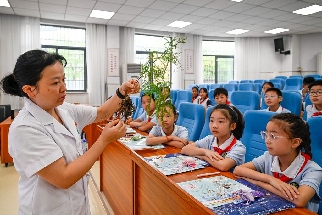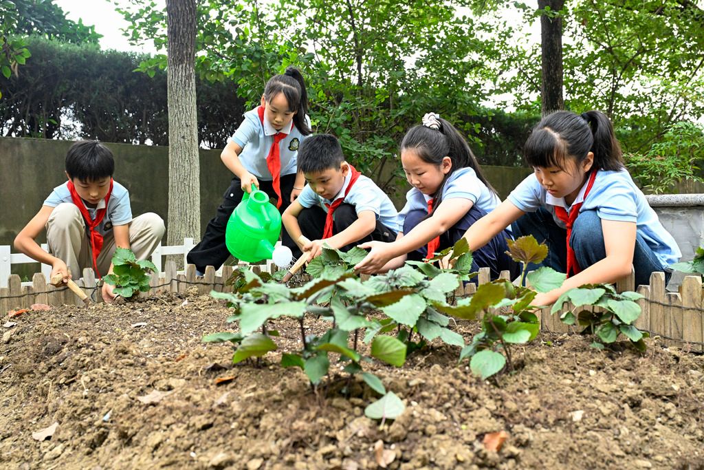 2025年9月23日,安徽合肥,庐阳区五一小学校园“百草园”内,小学生在中医药老师指导下学习种植中草药。