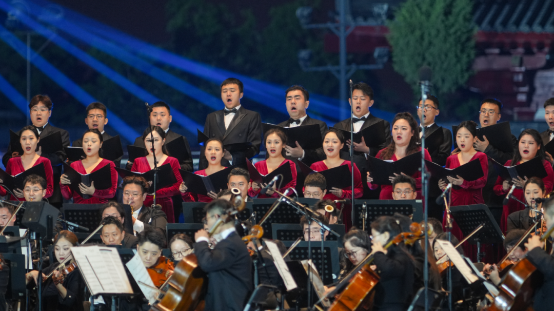 活动当天,肖斯塔科维奇《节日序曲》以慷慨澎湃的旋律揭开序幕,奏响对祖国的颂歌;任同祥创作的国粹经典《百鸟朝凤》以唢呐再现百鸟和鸣、凤凰展翅的盛景;柴可夫斯基《1812序曲》在现场炮声中震撼全场,将情绪推向顶点。石倚洁的《我住长江头》与《我和我的祖国》唱出了深沉的家国情怀,全场观众挥舞国旗齐声合唱,让大雁塔广场成为最动人的舞台。