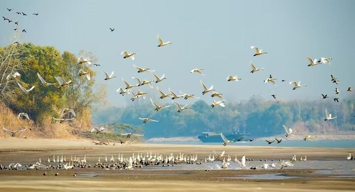 新济洲是长江入江第一洲,也是我国首个长江洲滩型湿地公园。曾经,生产开发让洲岛湿地生态受损。为守护长江生态,当地启动生态移民工程,岛上居民全部有序搬迁,为生态修复腾出空间。退渔还湿、岸线修复同步推进,昔日繁忙的渔业区化作水草丰茂的湿地,破损岸线重获生机,成为生物的理想家园。一系列举措让新济洲湿地率从39.98%跃升至69.91%,生态环境焕然一新;国家一级保护动物丹顶鹤、白枕鹤优雅降落,生物种类从1704种激增至1937种,生物多样性实现跨越式提升。