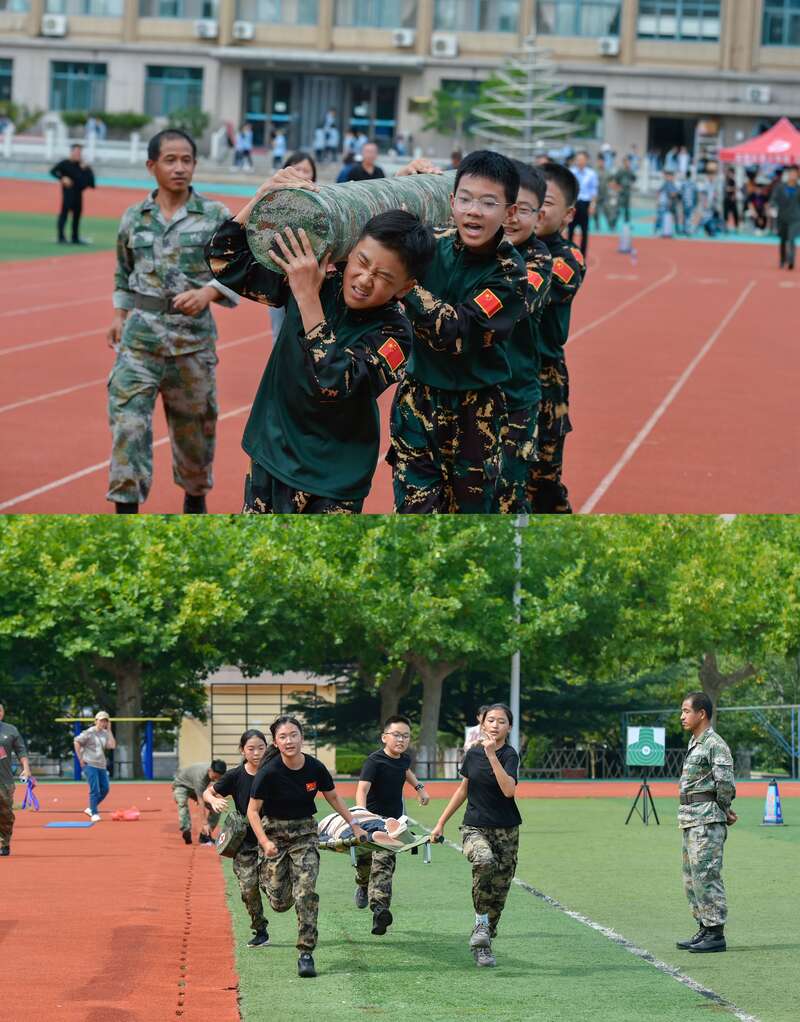 少年军校学员代表参加圆木负重和战场救护项目。(团山东省委供图)