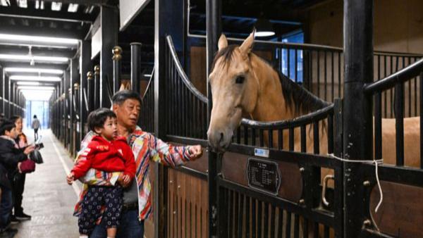 乌鲁木齐:游客观赏新疆古生态园汗血马基地