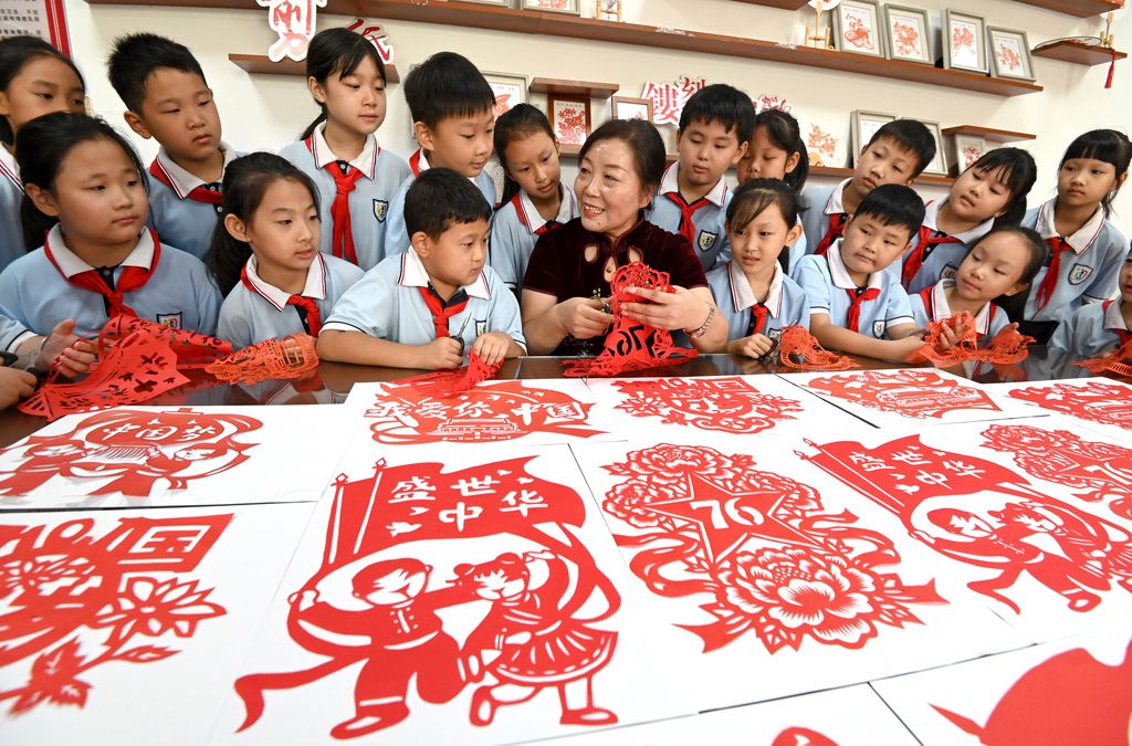 2025年9月28日,河北省邯郸市,复兴区铁路小学开展“巧手剪纸迎国庆”活动,师生亲手创作国庆主题剪纸作品,以指尖技艺传递对祖国的热爱与祝福,喜迎国庆佳节。