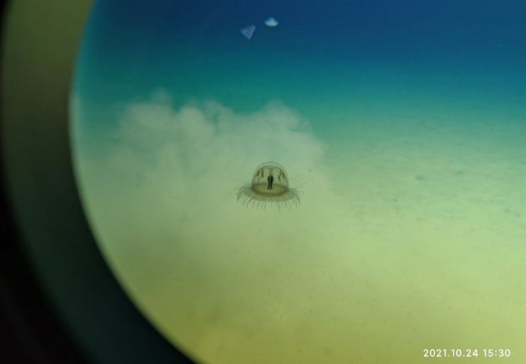 “奋斗者号”一点点往下探,赵维殳很快被迷住了。黑暗中,荧光生物常“chua”一下,流星般闪过窗口,黄的、绿的、蓝的、红的。坐底的那一刻,潜水器头部的探照灯打开,海水呈现出一种此生未见的幽蓝色,循着光映射的地方,她的眼睛好像不断在快速变焦。刚开始只有蓝;再聚焦,游动的透明小水母、小虾开始被瞳孔捕捉到;往下看,荒漠一般的海床,其实趴着透明的海参、海星、海葵……原以为是高压下“生命禁区”的深渊,呈现出异常繁荣盛大的“生命狂欢”。当时当刻,便成永恒。