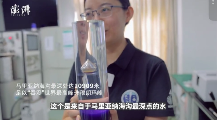 这滴水来自全世界最深的海底,马里亚纳海沟约11000米深处,那里水压高达1100个大气压,相当于20头大象站在一个指甲盖上。