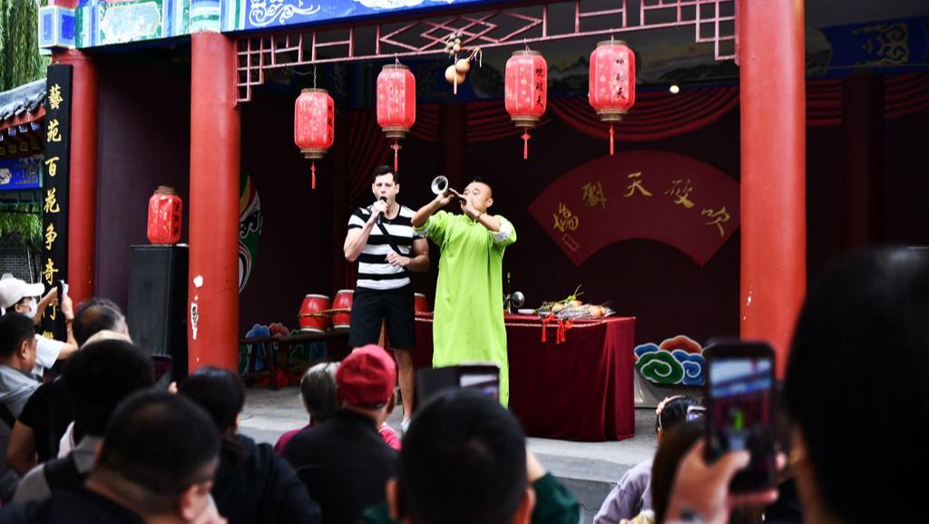 河北沧州:吴桥杂技大世界 外国游客与杂技艺人互动