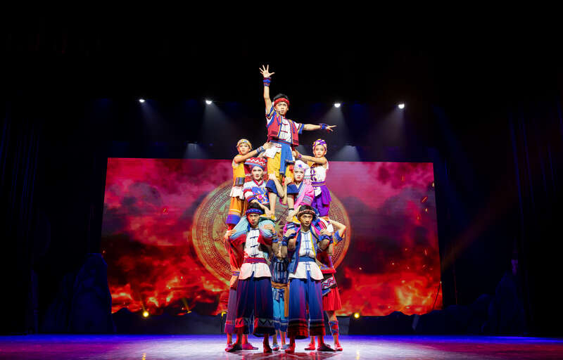 杂技剧《照破云天》以1943年抗日战争时期的柳州银仔山为背景,讲述了达岩、侬朗、阿娅、阿山等壮族少年,在民族危亡之际救助“飞虎队”飞行员杰克,并与日军斗智斗勇的故事。全剧以“少年壮志护山河”为主线,融合壮族文化元素与杂技艺术,通过转碟、柔术、手技、叠罗汉等技艺,展现中华少年在战火中淬炼出的坚毅与担当,诠释“山烧了还会长,人死了魂不散”的民族不屈精神。