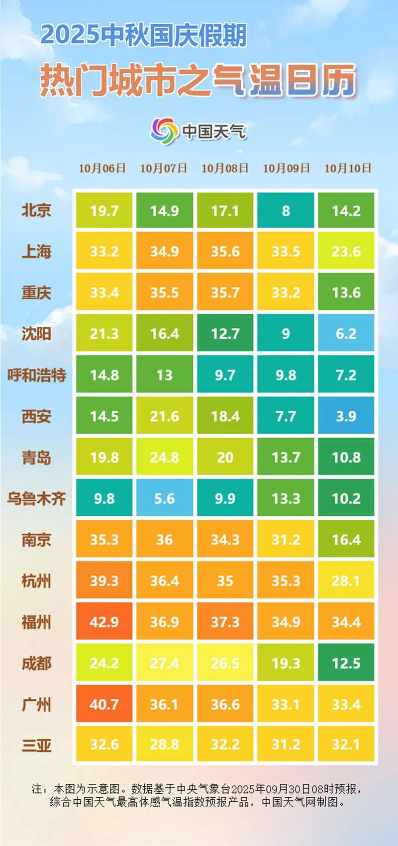 假期期间的全国天气仿佛一幅冷暖交织的拼图,既有秋高气爽的惬意,也有风雨添扰的挑战。各地体感温度也差异显著,出行请根据当地天气变化合理安排,做好健康防护。