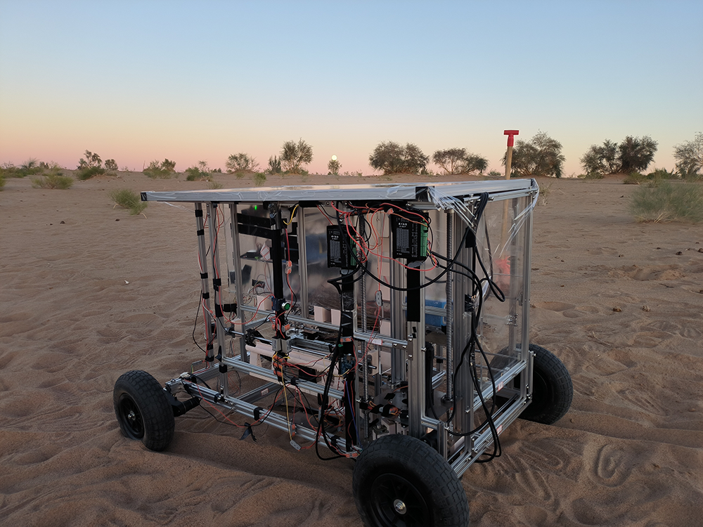 再更进一步,当年暑假“芒种”在手持机械的基础上不断迭代出成熟的自动种植车辆,并在沙漠中完成工作流程测试。除了自动完成种植外,借助摄像头、传感器等等,车辆还可以具备巡检功能。