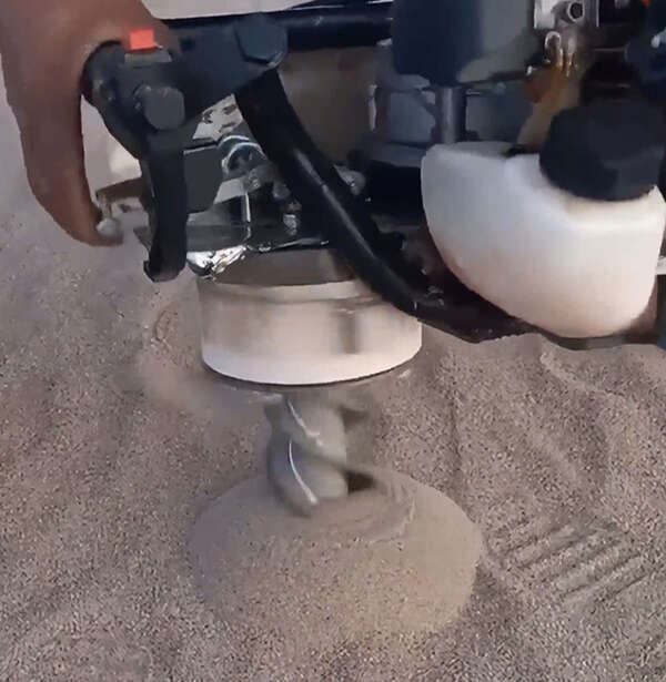 2024年初,这一结构被改装到传统的挖坑机上,手持中空挖坑机制作完成。那段时间,团队每隔几个月就要跑一趟民勤,在沙漠里不分昼夜地测试,不断地调试改造、整合优化,同时在当地开展一轮又一轮的调研,了解当地实际需求。
