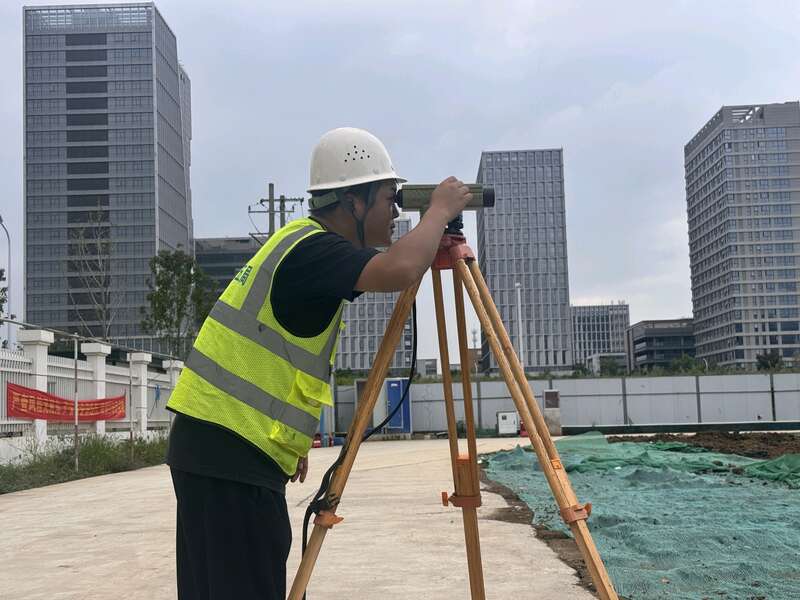 合肥埃科光电项目现场同样热火朝天,200余名青年建设者有序作业冲刺节点目标。30岁的测量主管谢文辉是现场的“数据把关人”,也是青年突击队骨干。他手持全站仪在施工区域反复测量核对,为项目推进提供可靠的技术支撑。